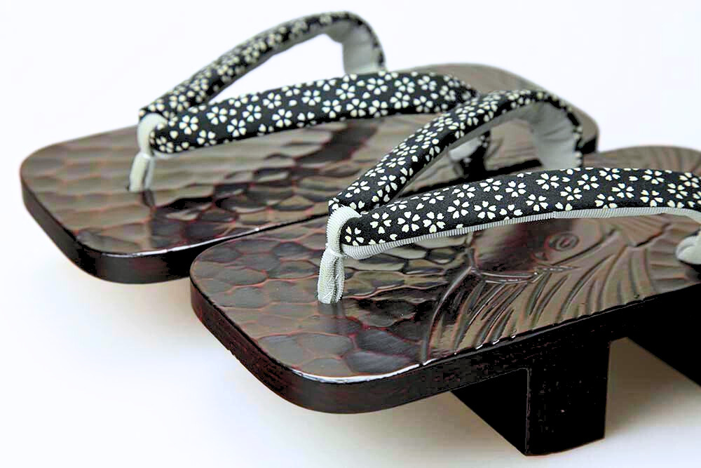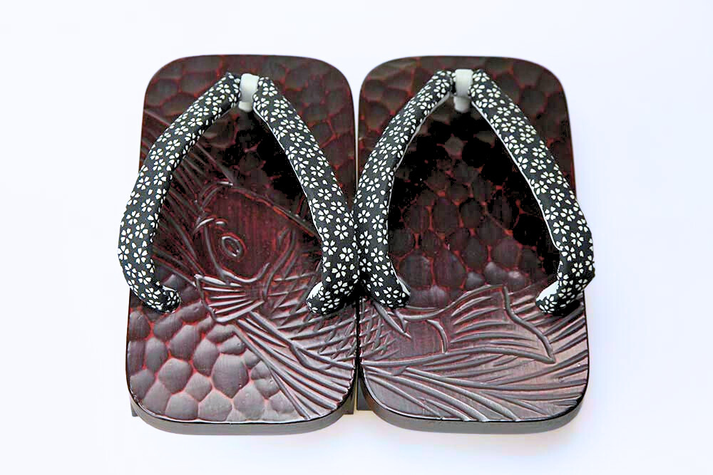 桐の台に鎌倉彫で彫られた「鯉」。履きやすい洒落た二本歯下駄に仕上がっています。脱いだ時に柄がひと続きに完成するのも粋そのもの