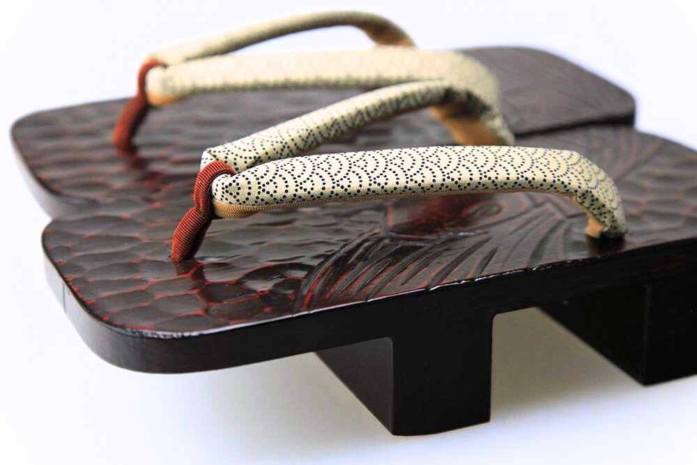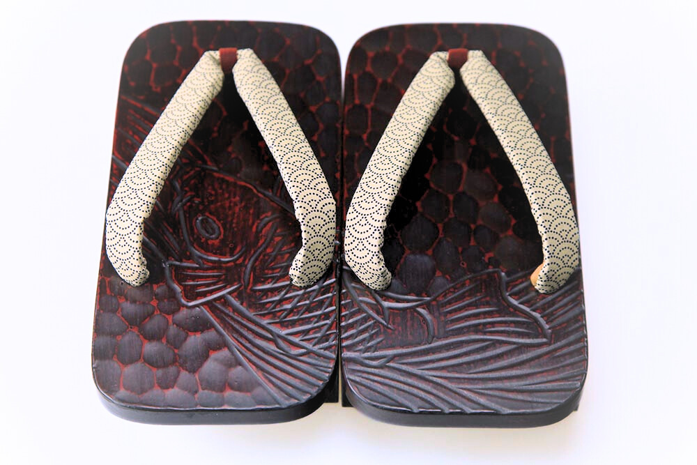 桐の台に鎌倉彫で彫られた「鯉」。履きやすい洒落た二本歯下駄に仕上がっています。脱いだ時に柄がひと続きに完成するのも粋そのもの
