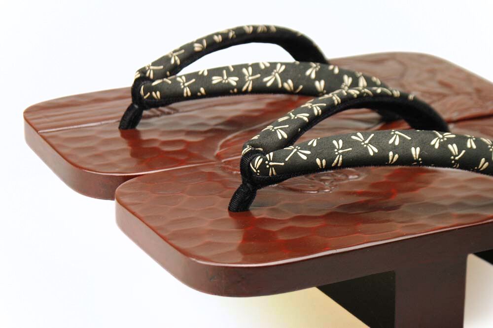 艶やかな漆に彫られた雄々しい「虎」。脱いだ時に柄がひと続きに完成するのも粋そのもの。鼻緒は印伝。拡大画像はこちら