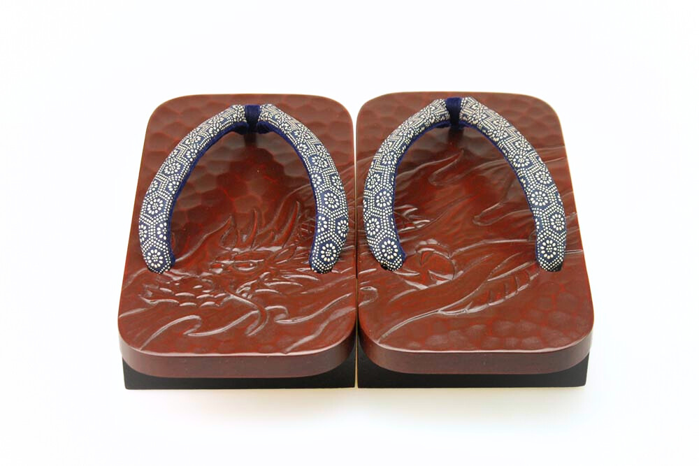 艶やかな漆に彫られた豪壮な「龍」。匠の彫と塗の技が生きた逸品です。脱いだ時に柄がひと続きに完成するのも粋そのもの。鼻緒は印伝