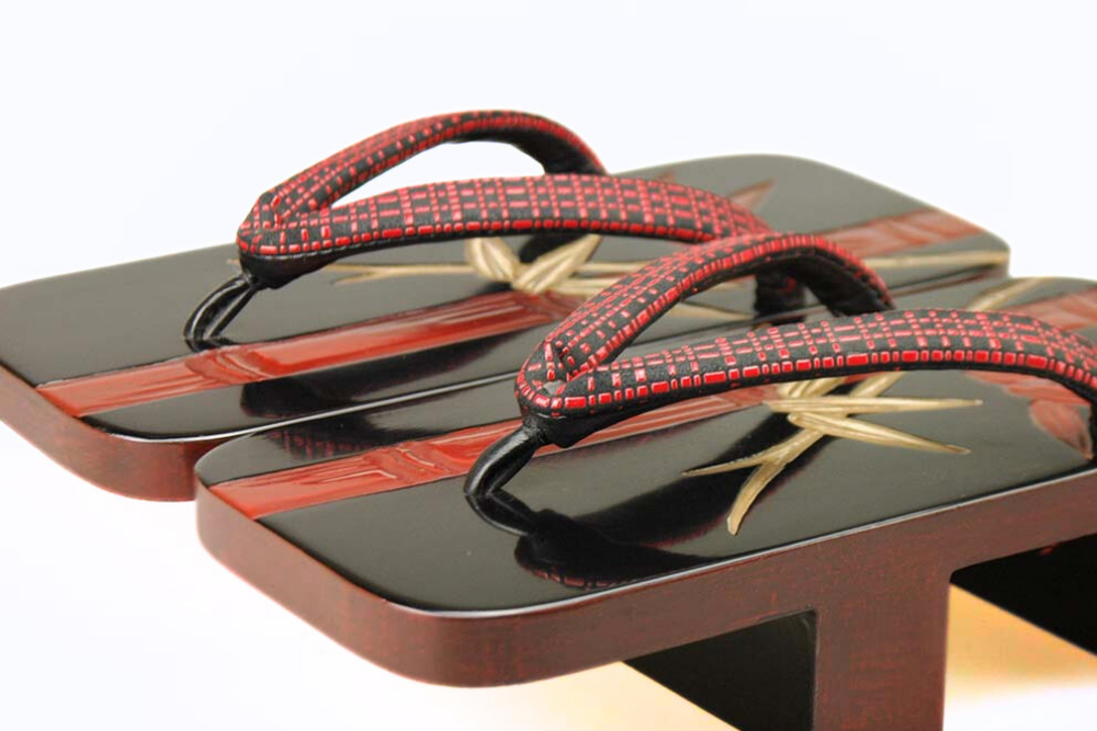 鎌倉800年の歴史を持つ鎌倉彫を施した逸品。艶やかな黒漆に「竹」の潔い姿を見事に彫り上げ、鮮やかに漆で着彩。彫と塗の技が生き、飾りとしても逸品。脱いだ時に柄がひと続きに完成するのも粋。鼻緒は印伝。拡大画像はこちら