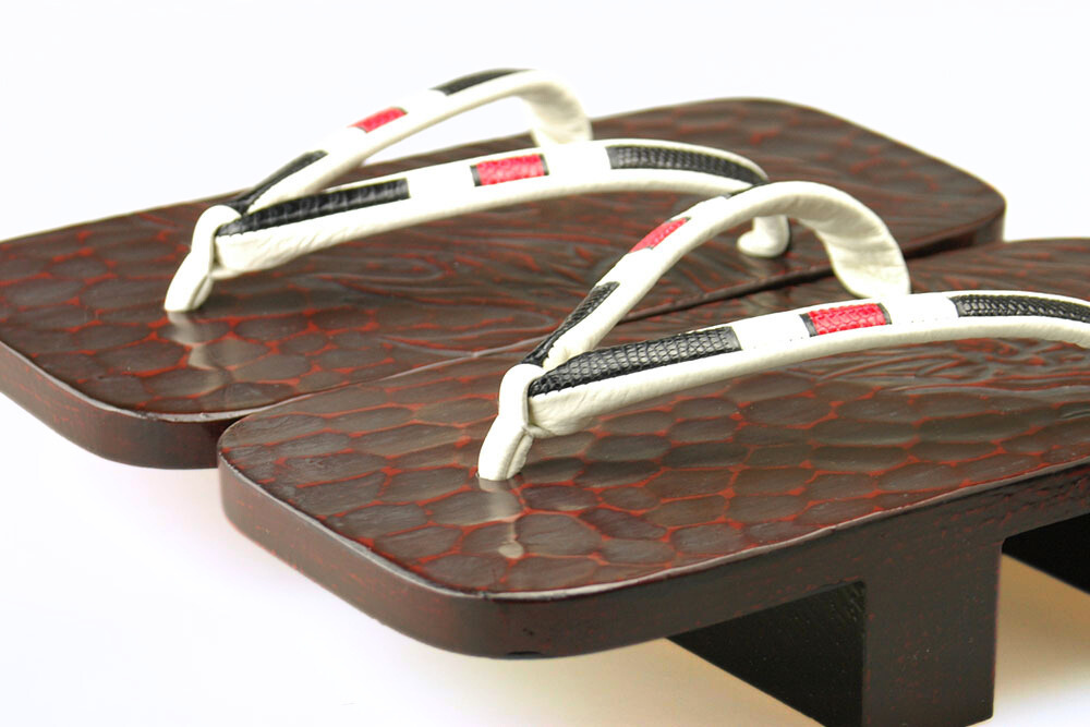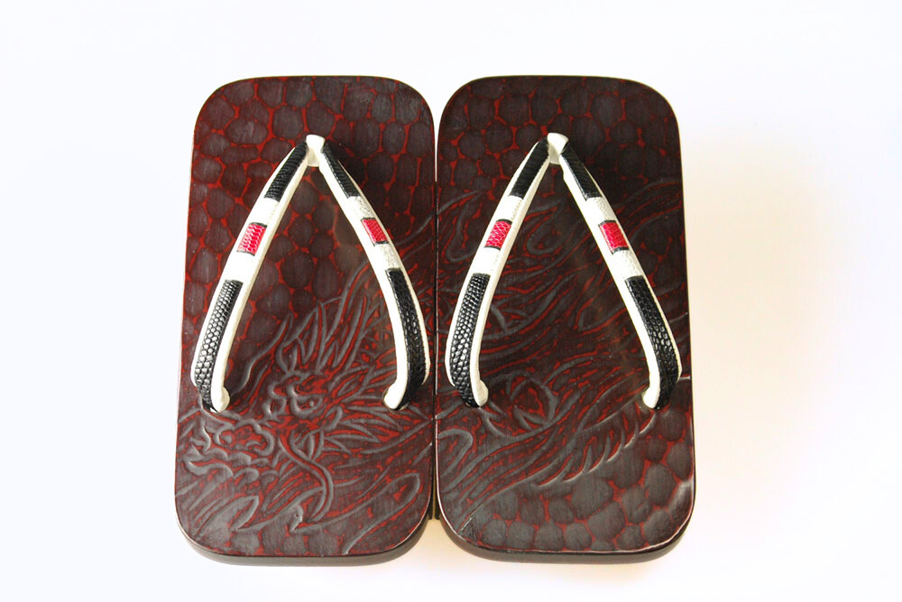 桐の台に鎌倉彫で彫られた「龍」。鼻緒はパッチ。履きやす洒落た二本歯下駄に仕上がっています。脱いだ時に柄がひと続きに完成するのも粋そのもの