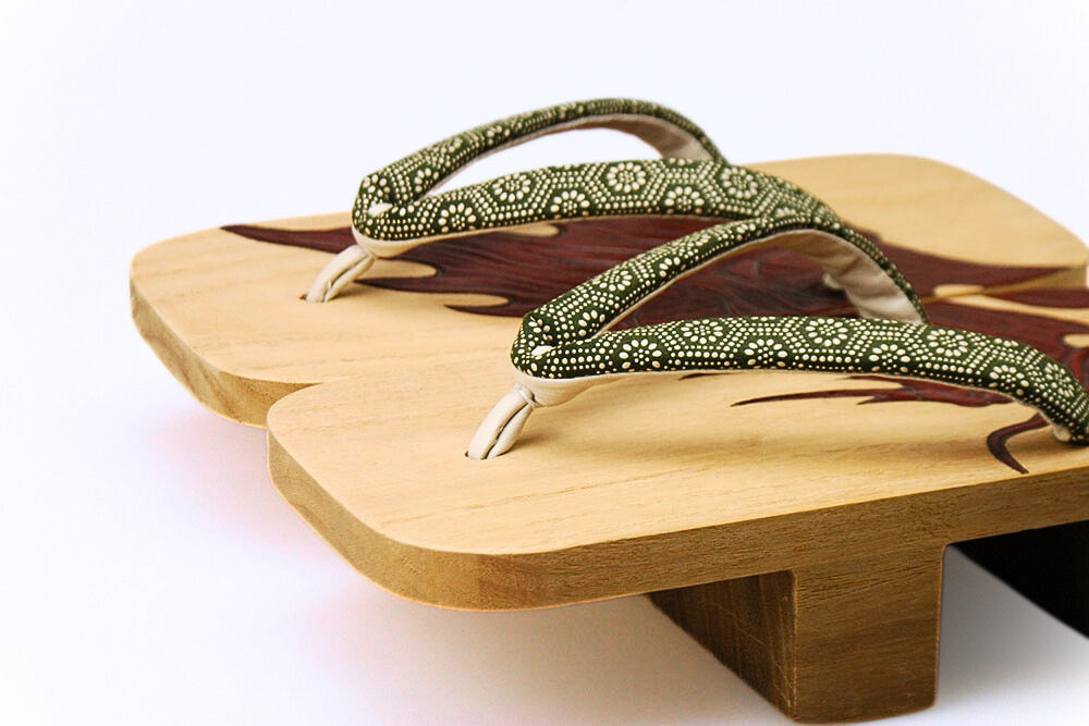 桐下駄の白木の柾目そのままを生かした上に、刻まれた鎌倉彫の彫と漆。古来の技法を復刻し、粋によみがえらせた個性的なお下駄。白木独特の汚れが付きにくいよう磨きを施してあります。彫の柄は龍、鼻緒は印伝。