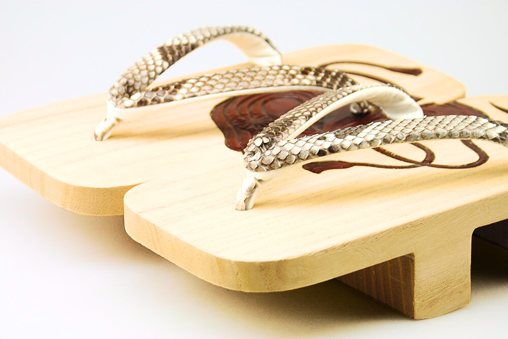 桐下駄の白木の柾目そのままを生かした上に、刻まれた鎌倉彫の彫と漆。古来の技法を復刻し、粋によみがえらせた個性的なお下駄。白木独特の汚れが付きにくいよう磨きを施してあります。彫の柄は翁、鼻緒は錦ヘビ。