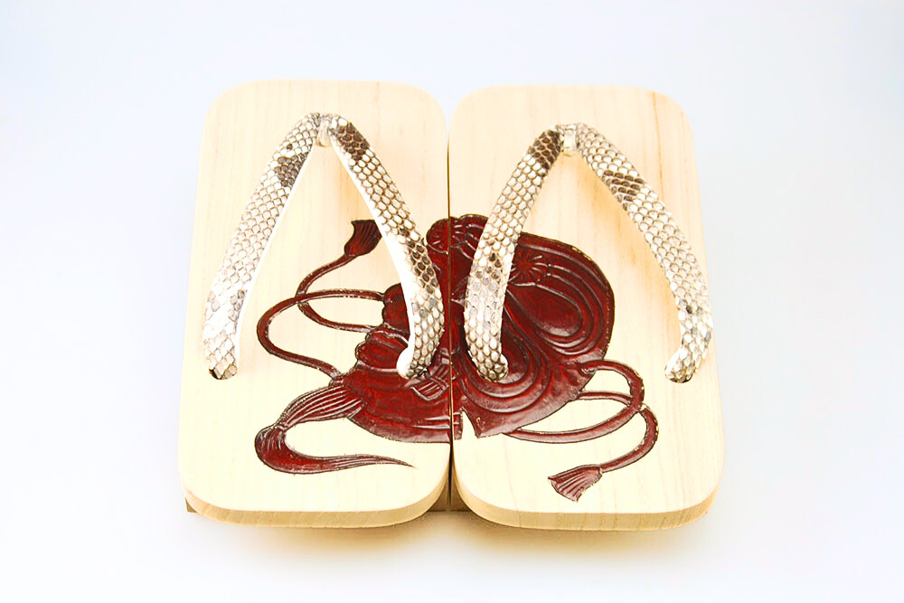 桐下駄の白木の柾目そのままを生かした上に、刻まれた鎌倉彫の彫と漆。古来の技法を復刻し、粋によみがえらせた個性的なお下駄。白木独特の汚れが付きにくいよう磨きを施してあります。彫の柄は翁、鼻緒は錦ヘビ。