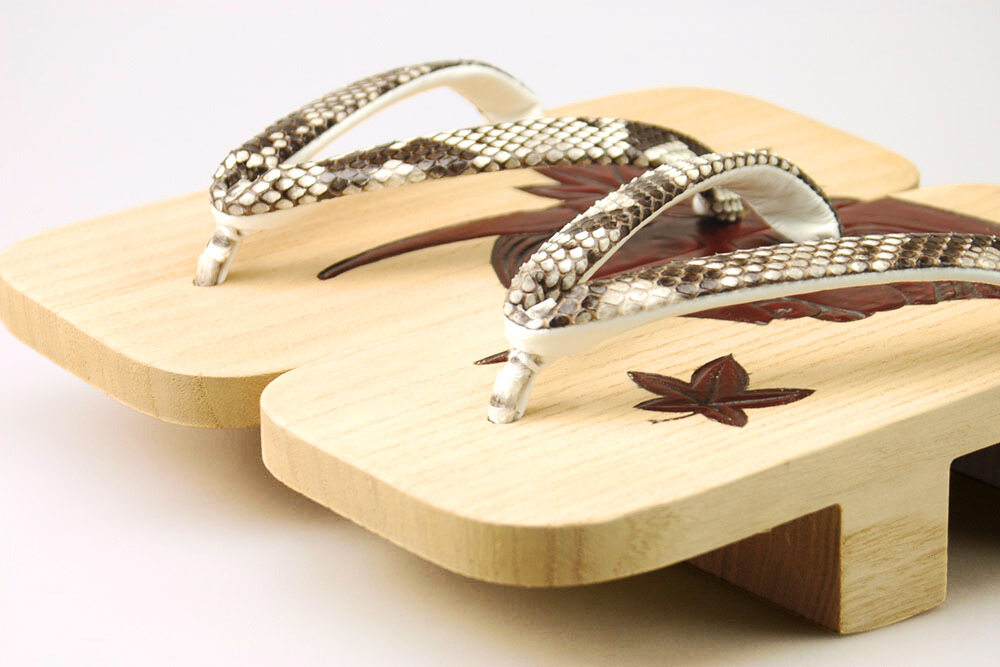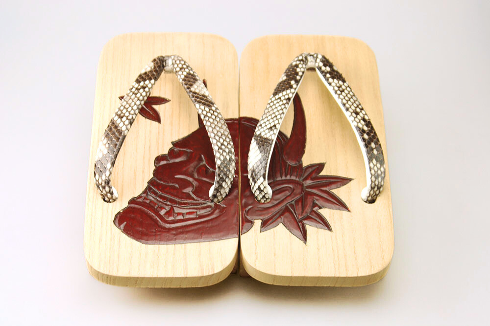 桐下駄の白木の柾目そのままを生かした上に、刻まれた鎌倉彫の彫と漆。古来の技法を復刻し、粋によみがえらせた個性的なお下駄。白木独特の汚れが付きにくいよう磨きを施してあります。彫の柄は般若、鼻緒は錦ヘビ。