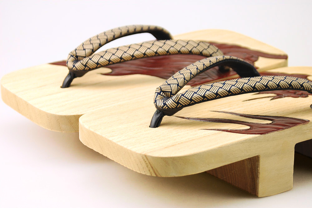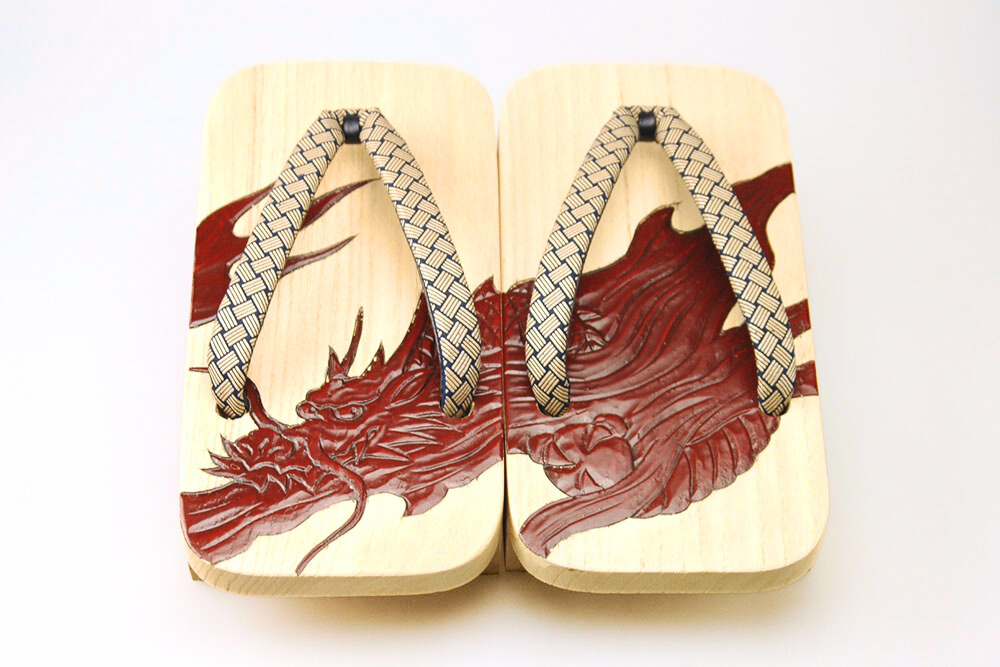 桐下駄の白木の柾目そのままを生かした上に、刻まれた鎌倉彫の彫と漆。古来の技法を復刻し、粋によみがえらせた個性的なお下駄。白木独特の汚れが付きにくいよう磨きを施してあります。彫の柄は龍、鼻緒は印伝。