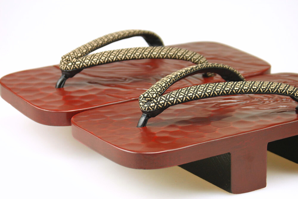 艶やかな漆に彫られた豪壮な「龍」。匠の彫と塗の技が生きた逸品です。脱いだ時に柄がひと続きに完成するのも粋そのもの。鼻緒は印伝高原