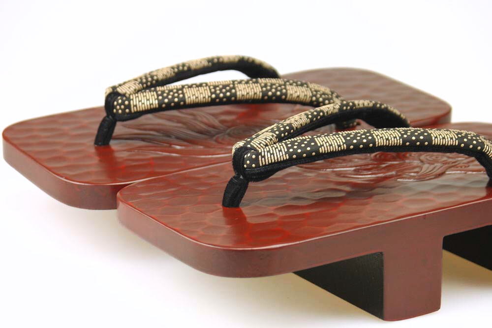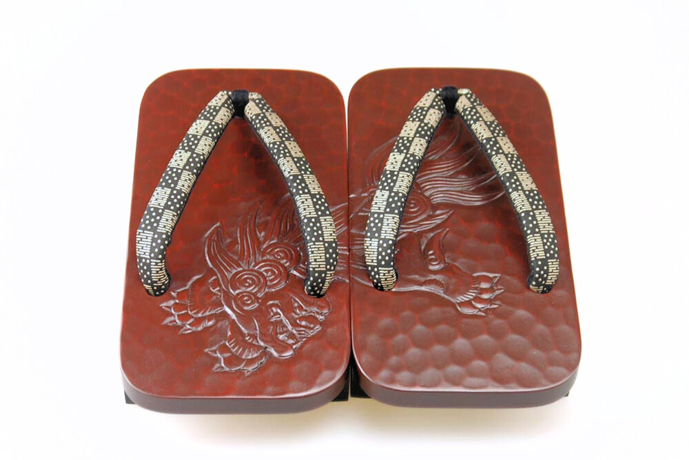 艶やかな漆に彫られた雄々しい「獅子」。匠の彫と塗の技が生きた逸品です。脱いだ時に柄がひと続きに完成するのも粋そのもの。鼻緒は印伝高原。拡大画像はこちら