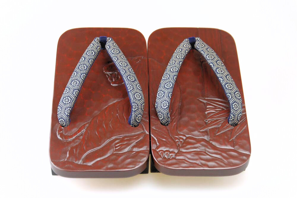 艶やかな漆に彫られた勇猛な「虎」。匠の彫と塗の技が生きた逸品です。脱いだ時に柄がひと続きに完成するのも粋そのもの。鼻緒は印伝高原。拡大画像はこちら