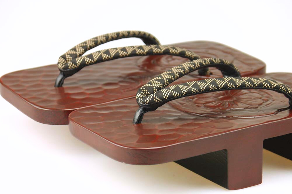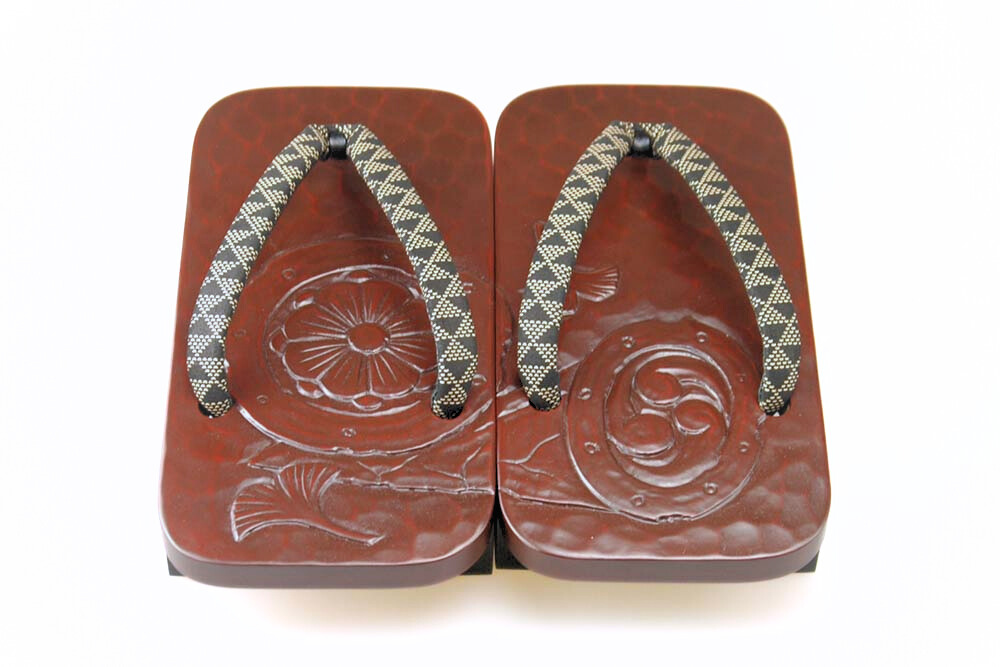 艶やかな漆に彫られた伝統柄「古瓦」。匠の彫と塗の技が生きた逸品です。脱いだ時に柄がひと続きに完成するのも粋そのもの。鼻緒は印伝高原。