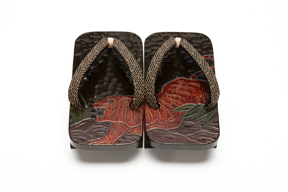 厳選された桐の台に、鎌倉彫の伝統技法で「虎」の文様が施された紳士下駄です。