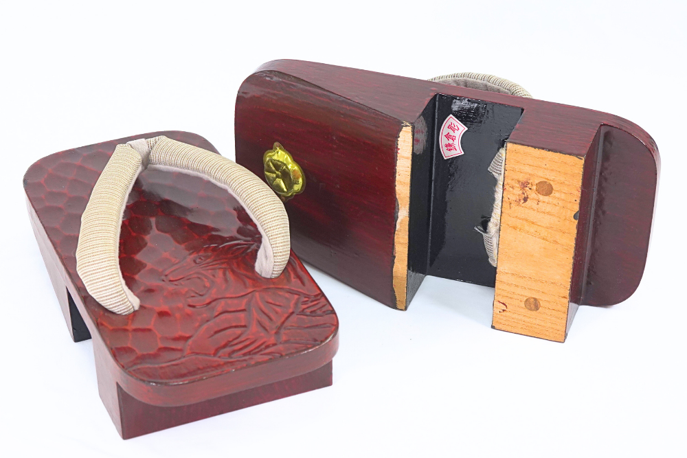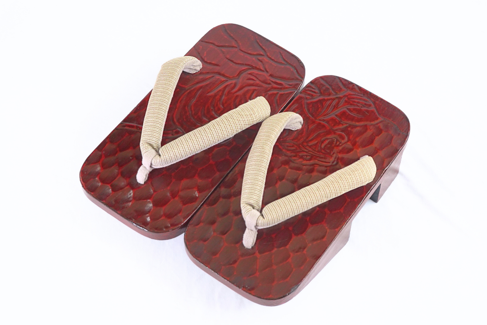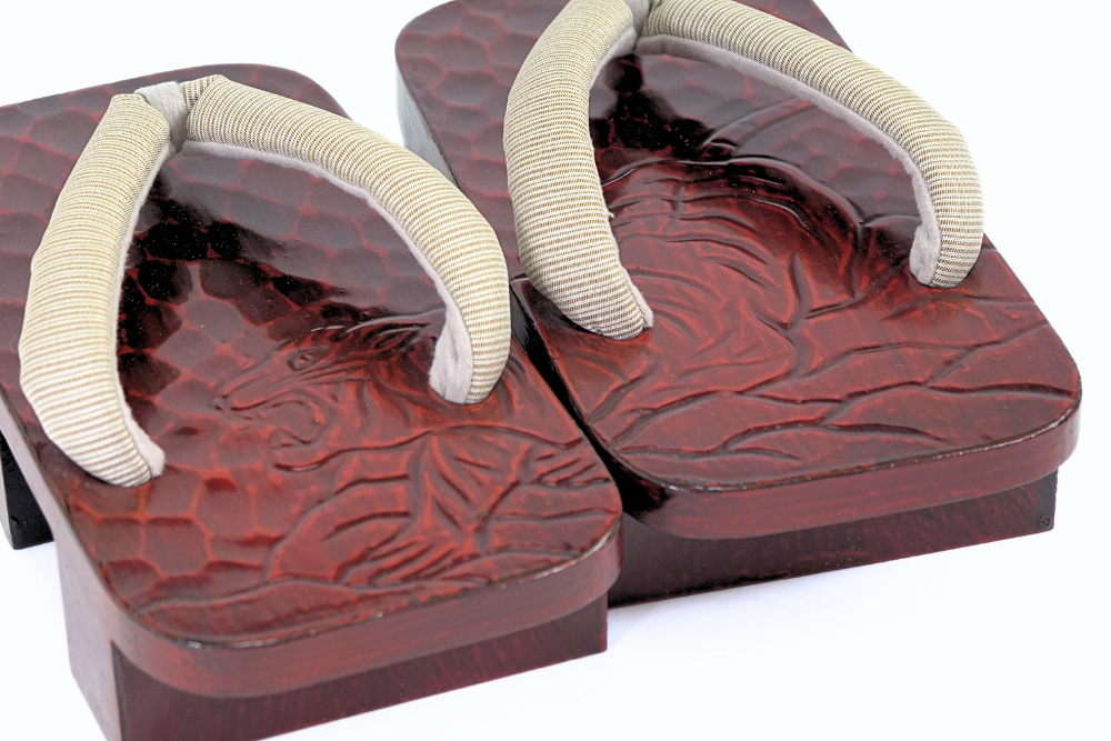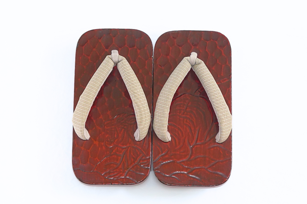 厳選された桐の台に、鎌倉彫の伝統技法で「虎」の文様が施された紳士下駄です。