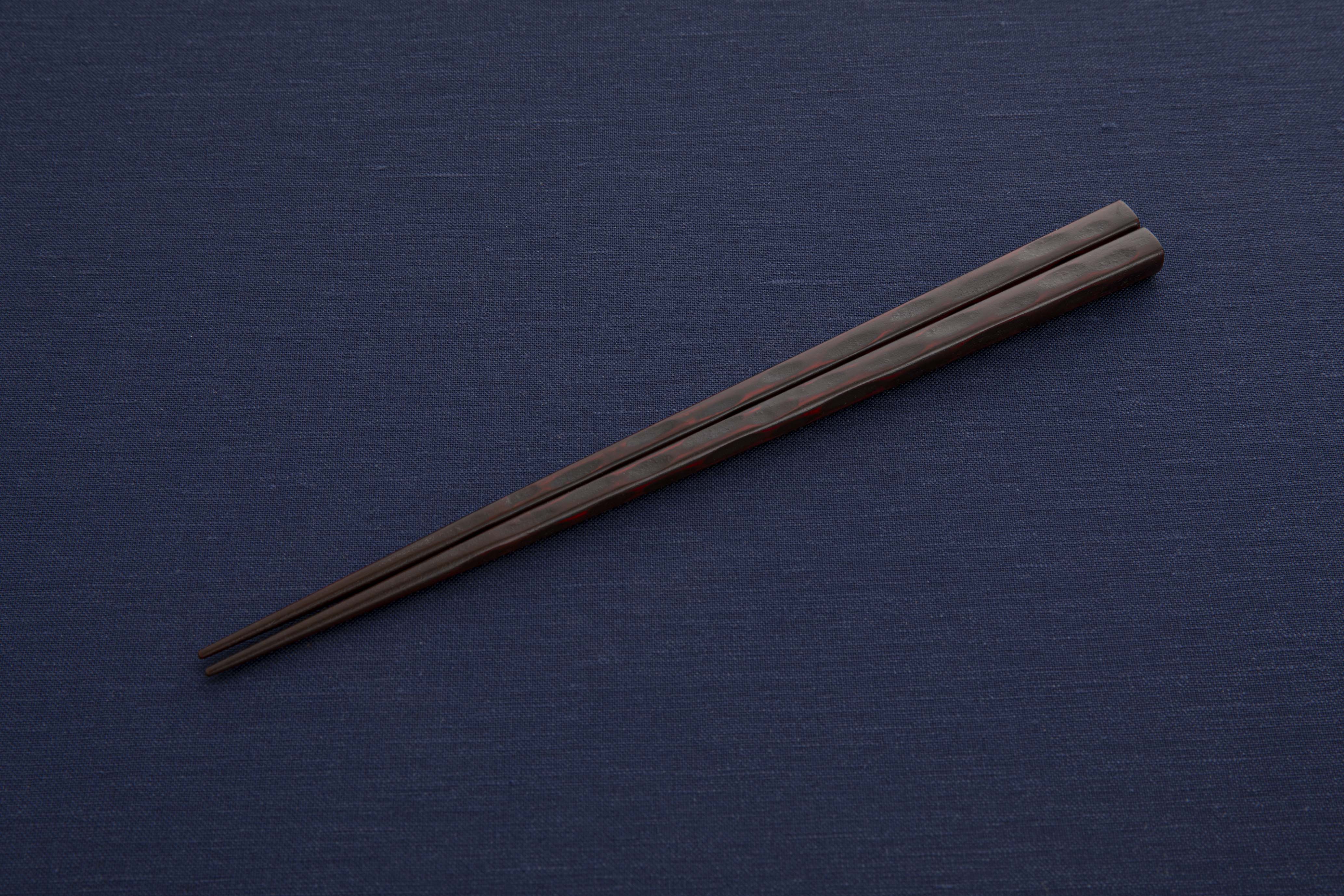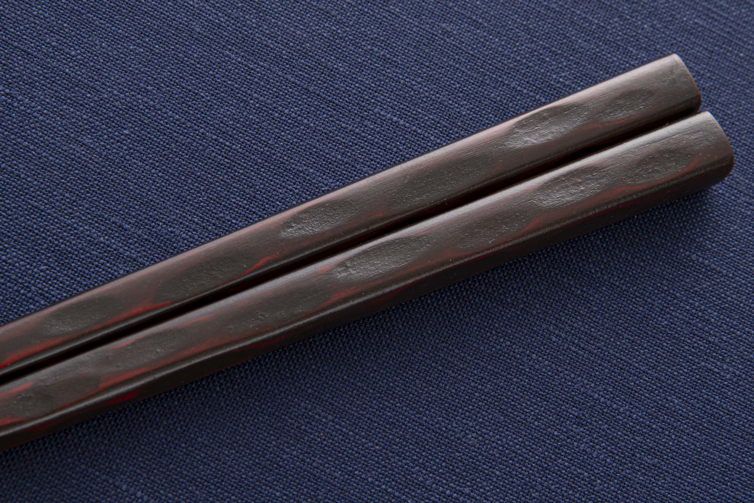 鎌倉彫らしい彫刻刀の痕のみでデザインされたお箸です。鎌倉彫らしいお色と風合いをお楽しみいただける乾口塗りのお箸です。